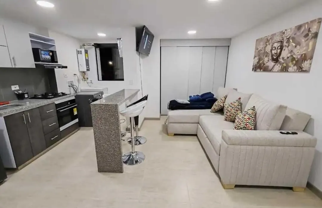 Apartamento Moderno Frente A La Universidad Santo Tomas Wifi Y Parqueaderoの設備の整った台所を利用でき、おいしい自家製の食事を作ることができます。 最寄りのバス停Estacion Centro Norteは、宿泊施設から徒歩でたった10分先にあります。